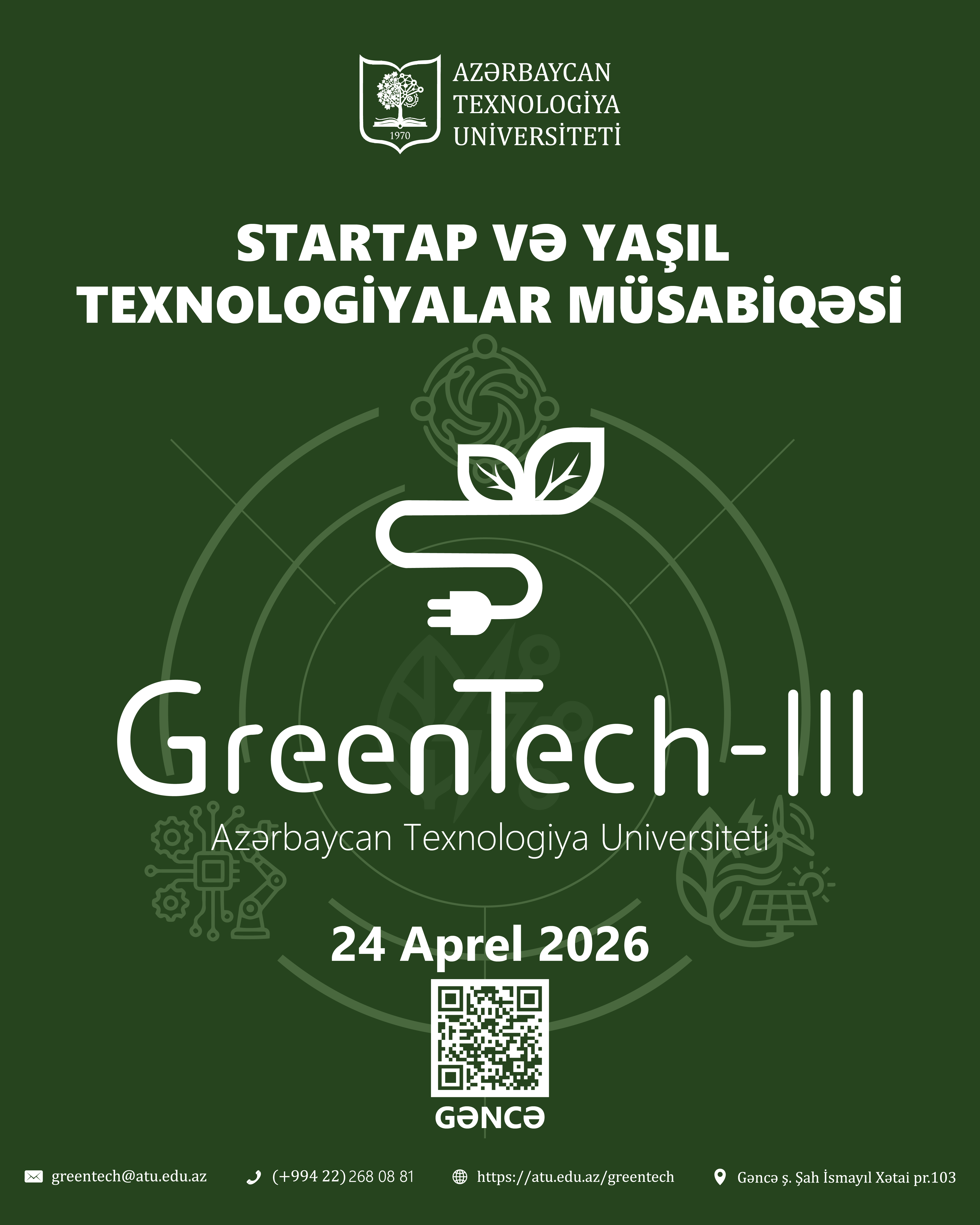 Qeydiyyat https://atu.edu.az/greentech veb-səhifəsi vasitəsilə 6 aprelədək davam edəcək. Yarışın final mərhələsi 24 aprel 2026-ci il tarixində Azərbaycan Texnologiya Universitetində keçiriləcək.Komandaların Bakıdan Gəncəyə və əks istiqamətdə transferi təşkil olunacaq.