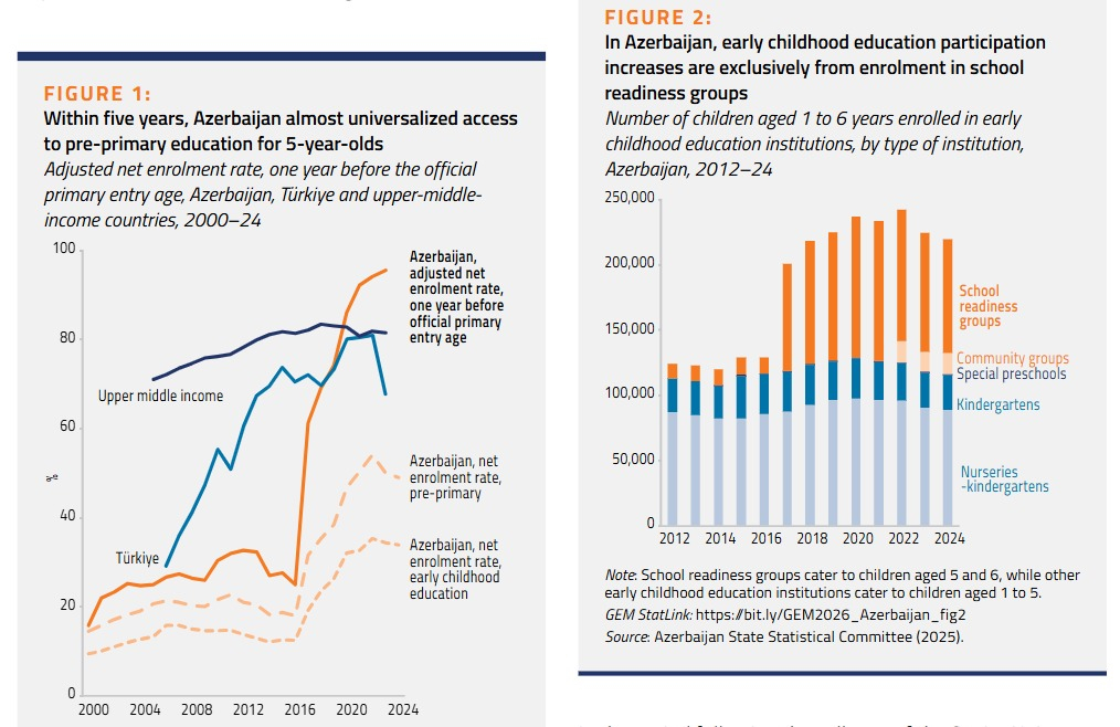 Hesabatın “Məktəbəqədər təhsil” fəslində ölkəmizə aid hissəsində qeyd olunur ki, Azərbaycan son dövrlərdə 5 yaşlı uşaqlar üçün məktəbəqədər təhsilə çıxışı əhəmiyyətli dərəcədə artırıb: “Cəmi beş il ərzində Azərbaycan 5 yaşlı uşaqlar üçün məktəbəqədər təhsilə çıxışı demək olar ki, universal səviyyəyə çatdırıb”. Cəmi beş il ərzində, 2021-ci ildə bu göstərici demək olar ki, ümumi əhatə səviyyəsinə çataraq 92%-ə yüksəlib.Daha kiçik yaş qruplarını (3–5 yaşlılar və 1–5 yaşlılar) əhatə edən digər iki iştirak göstəricisi üzrə də təsirli artımlar qeydə alınıb.