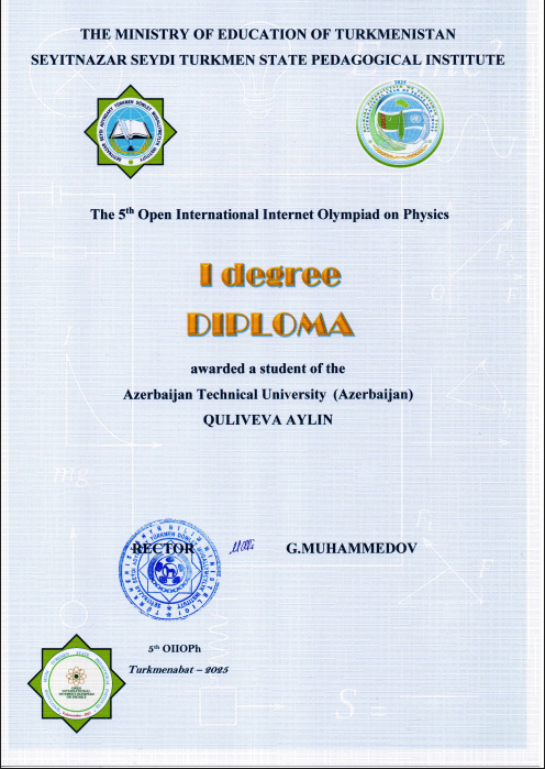Azərbaycan Texniki Universitetinin (AzTU) “İnformasiya texnologiyaları və telekommunikasiya” ixtisasının tələbəsi Aylin Quliyeva 5 dekabr 2025-ci il tarixində Türkmənistan Respublikasının Təhsil Nazirliyi və Seyitnazar Seydi adına Türkmən Dövlət Pedaqoji İnstitutunun təşkilatçılığı ilə keçirilən V Açıq Beynəlxalq internet Fizika Olimpiadasında I dərəcəli diploma layiq görülüb.