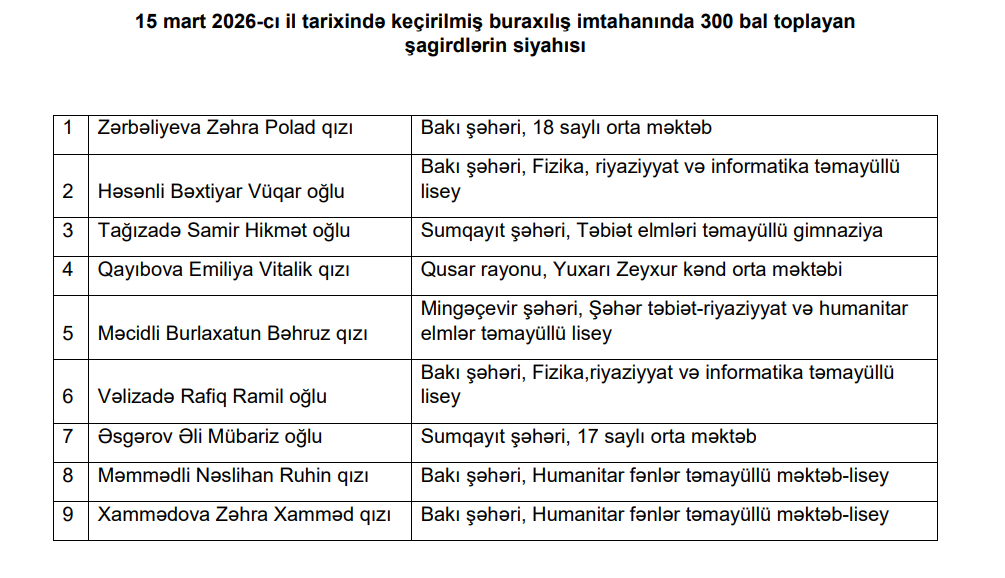 Tam (11 illik) orta təhsil səviyyəsi üzrə 15 mart 2026-cı il tarixində keçirilmiş buraxılış imtahanının nəticələri elan olunub.