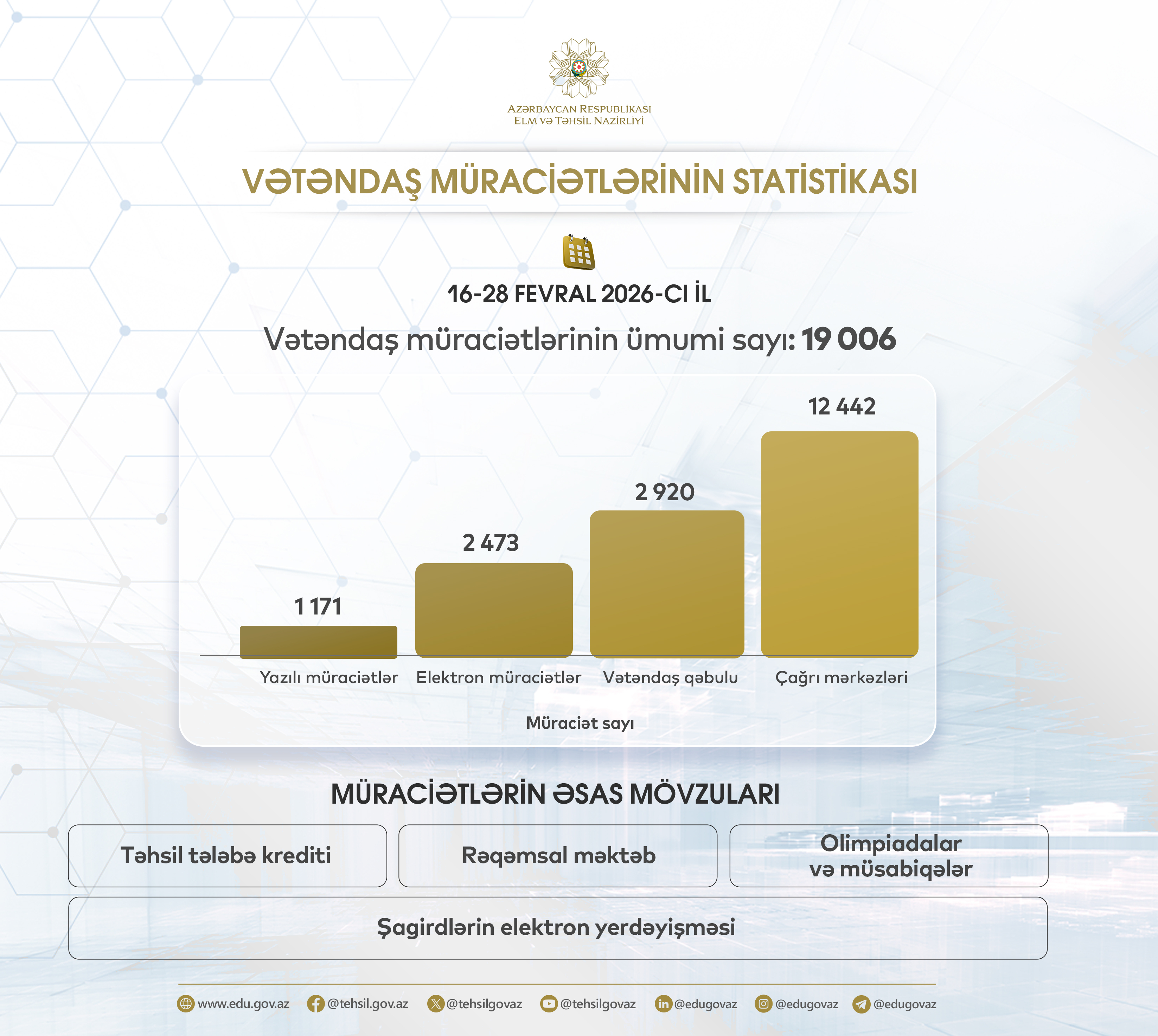 Fevralın 16-dan 28-dək Elm və Təhsil Nazirliyi, eləcə də qurumlarına 19 006 vətəndaş müraciəti daxil olub.