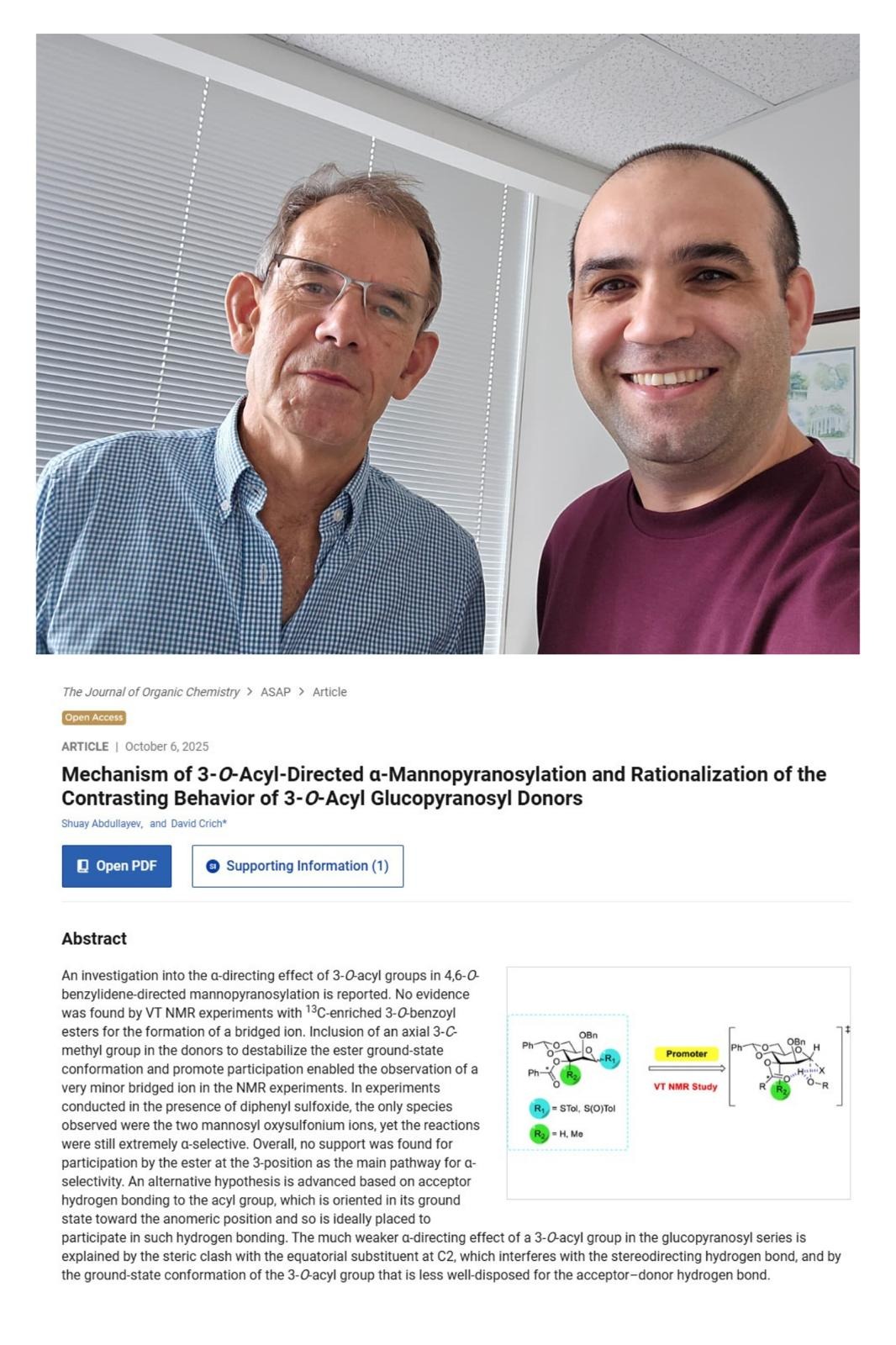 “Azərbaycan müəllimi” xəbər verir ki, ABŞ-nin Corciya Universitetinin Kompleks Karbohidrat Araşdırmaları Mərkəzi (CCRC) və Farmasevtik və Biotibbi Elmlər Departamentinin (PBS) tədqiqatçısı, azərbaycanlı alim, kimya üzrə fəlsəfə doktoru dr. Şuay Abdullayevin də daxil olduğu beynəlxalq elmi qrupun məqaləsi nüfuzlu “Journal of Organic Chemistry (JOC)” jurnalında dərc olunub.