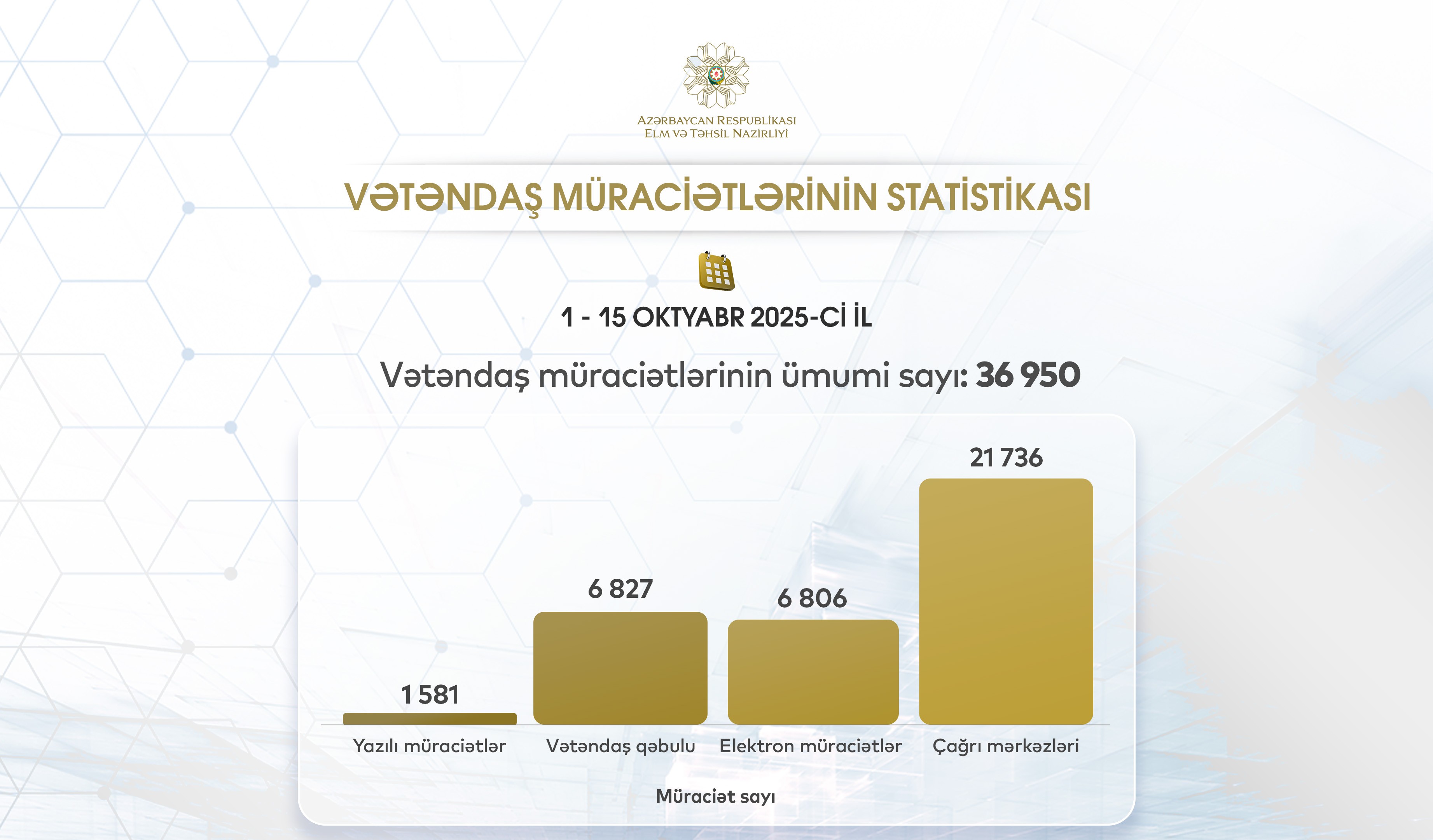 Oktyabrın 1-dən 15-dək Elm və Təhsil Nazirliyi, eləcə də qurumlarına 36 950 vətəndaş müraciəti daxil olub.