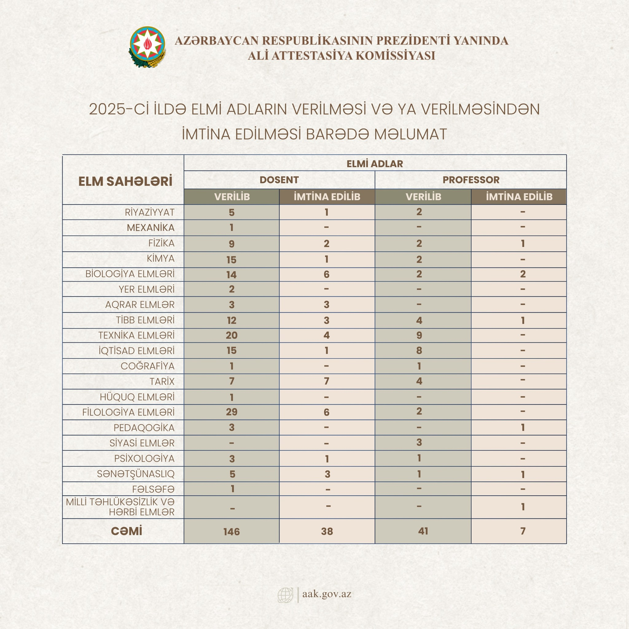 2025-ci ildə müxtəlif elm sahələri üzrə 146 nəfərə dosent, 41 nəfərə professor elmi adı verilib. Eyni zamanda 38 dosent, 7 professor elmi adının verilməsindən imtina edilib.