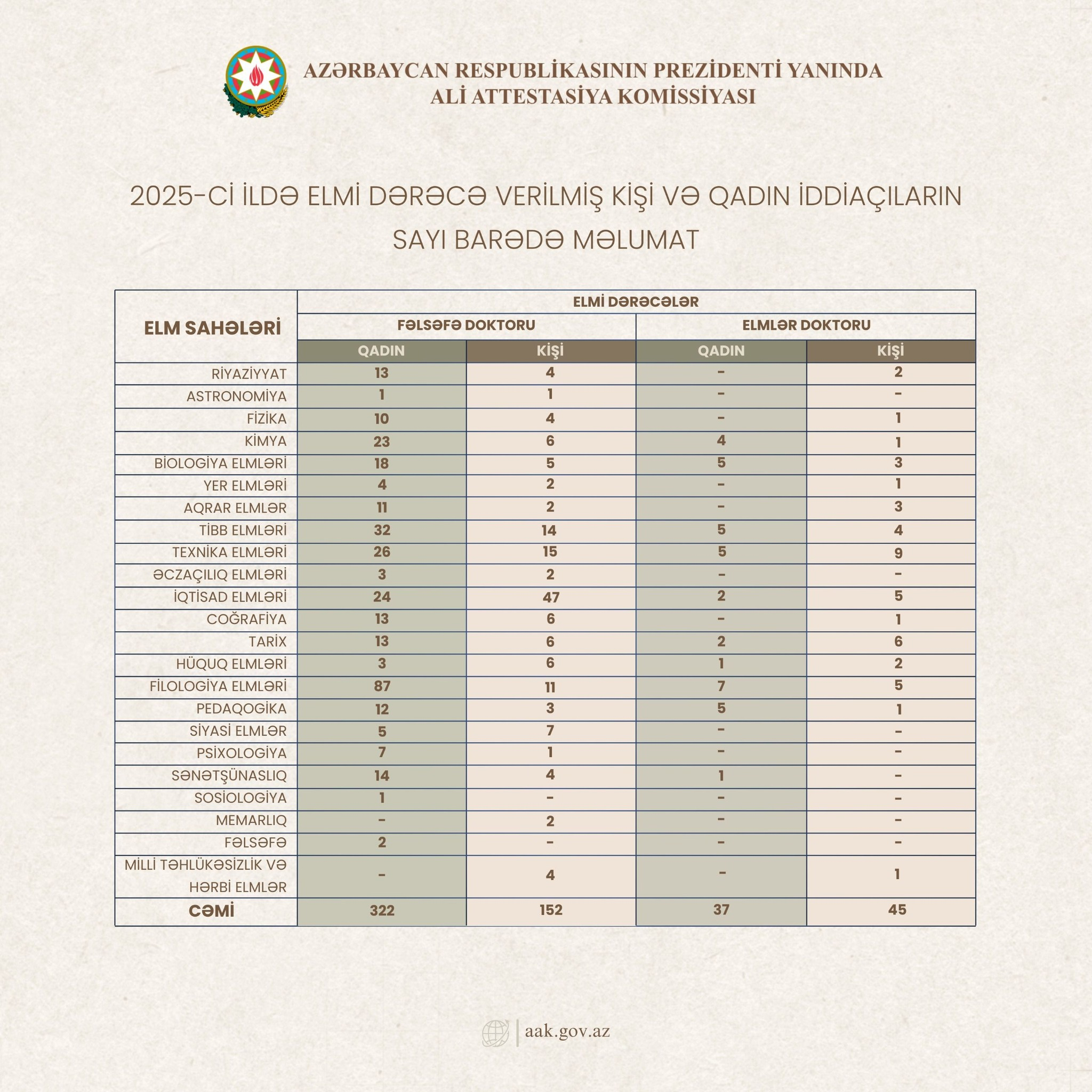 Statistikaya görə, fəlsəfə doktoru elmi dərəcəsi alanlar arasında 322 nəfər qadın, 152 nəfər kişi olub. Elmlər doktoru üzrə isə 37 qadın, 45 kişi bu ali elmi dərəcəyə layiq görülüb.