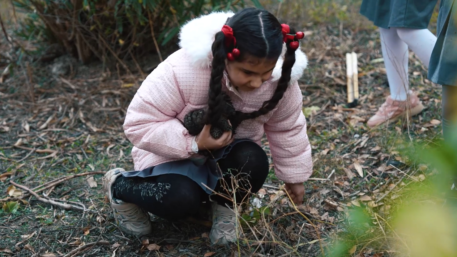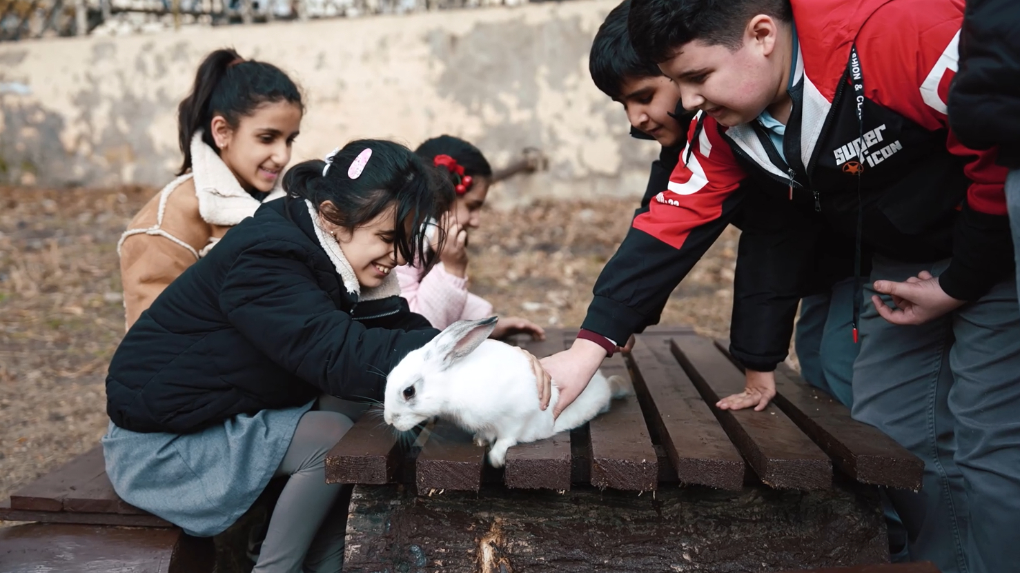 Bir neçə uşaq səs-küy ilə balaca dovşan balasını sığallayır, bəziləri isə yerə tökülmüş ağac qozalarını toplayaraq əl işi hazırlamağa çalışırlar. Balaca bir qız isə bir gül budağının, hər yarpağa toxunaraq onu hiss etməyə çalışır. Onlar həyatı addım-addım hiss edərək tanıyırlar.