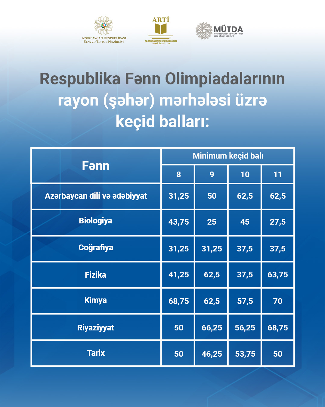 Respublika Fənn Olimpiadalarının rayon (şəhər) mərhələsinin nəticələri ilə bağlı ərizələr 3 iş günü ərzində (5 fevral 17:00-a qədər) qəbul edilir. Müraciətlər office@arti.edu.az elektron ünvanına yazılı şəkildə göndərilməlidir.