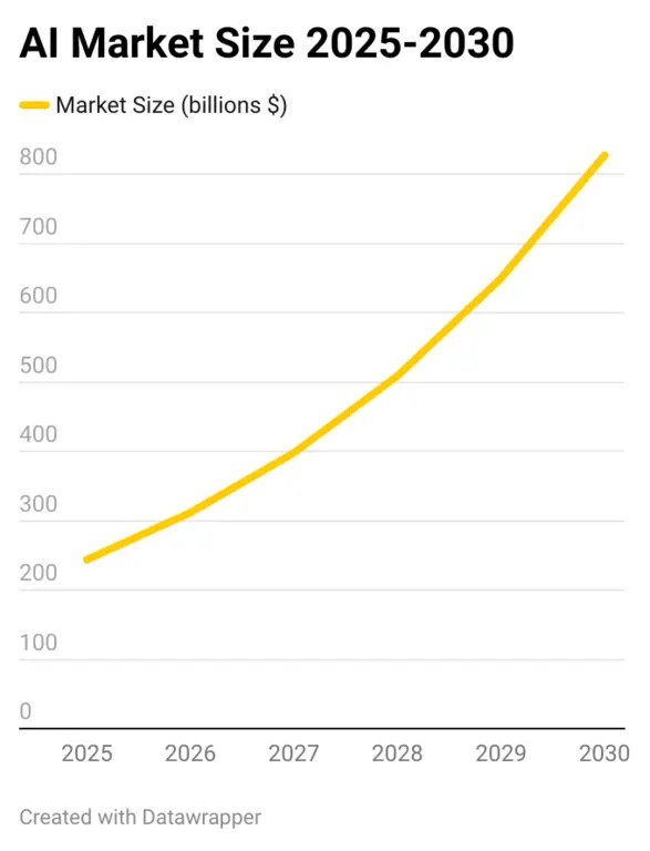 Süni intellekt texnologiyaları bazarı olduqca genişdir və 2025-ci ildə təxminən 244 milyard ABŞ dolları həcmində qiymətləndirilir. Bu göstəricinin 2030-cu ilə qədər 800 milyard ABŞ dollarını keçəcəyi gözlənilir. 2025-ci ildə generativ süni intellekt bazarının həcmi isə 63 milyard ABŞ dolları olub.