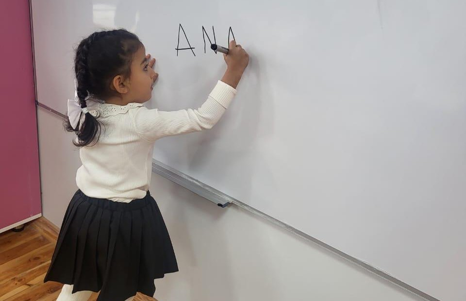 "Uşaqlar bu gün sizinlə yeni rəsmlər çəkəcək və yeni adlar öyrənəcəyik. Amma keçən dərs sizə rəqəmləri təkrar edəcəyimizi demişdim. Evdə üzərində işləmisinizmi?" "Bəli, müəllim", - cavabını alandan sonra "mən lövhəyə gələ bilərəm", - deyən balacaya baxırıq. Müəllimin təsdiq cavabından sonra lövhə qarşısındakı balaca yazmağa başlayır.