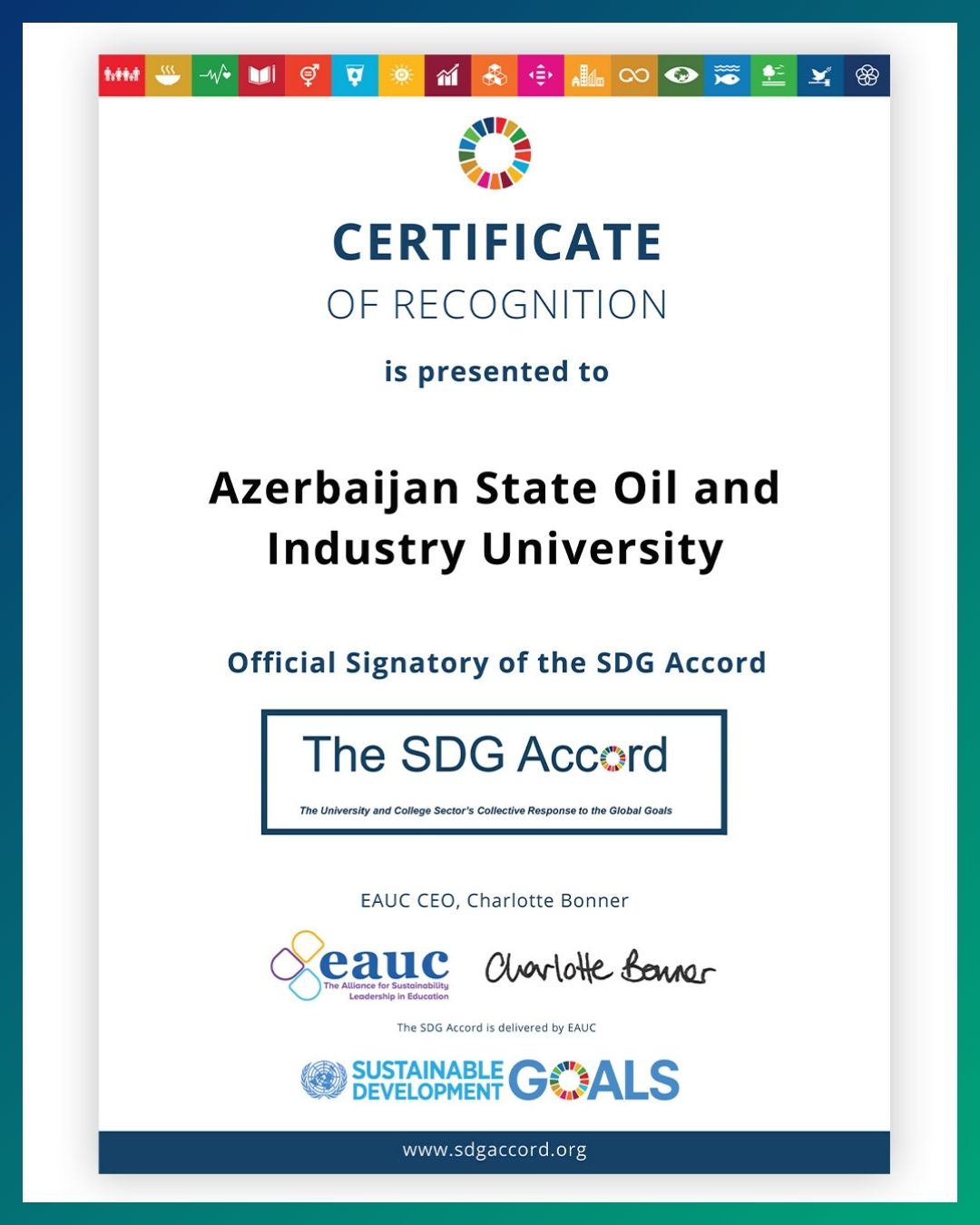 Azerbaycan Dövlət Neft və Sənaye Universiteti (ADNSU) dayanıqlı inkişaf və sosial ədalət prinsiplərinə sadiqliyini nümayiş etdirərək, qlobal miqyasda nüfuzlu bir təşəbbüs olan “SDG Accord”a (Dayanıqlı İnkişaf Məqsədləri Razılaşması) rəsmi olaraq qoşulub.