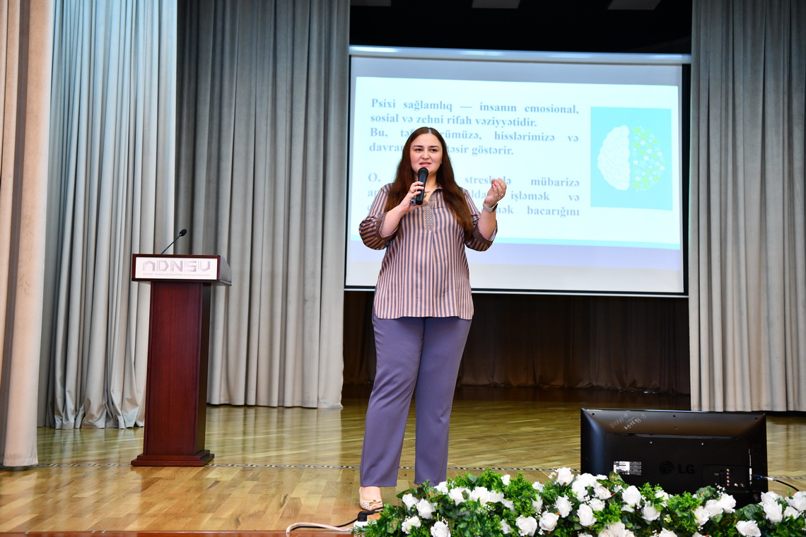 Təlim ADNSU-nun məsləhətçi psixoloqu Fatimə Kərimli tərəfindən aparılıb. Təlimdə psixi sağlamlığın əhəmiyyəti, onu qoruma və dəstəkləmək yolları, eləcə də sosial mühitdə psixoloji rifahın təmin edilməsi mövzuları müzakirə olunub. Tələbələrə psixoloji sağlamlığın gündəlik həyatda rolu izah edilib və streslə mübarizə yolları barədə praktiki tövsiyələr təqdim olunub.