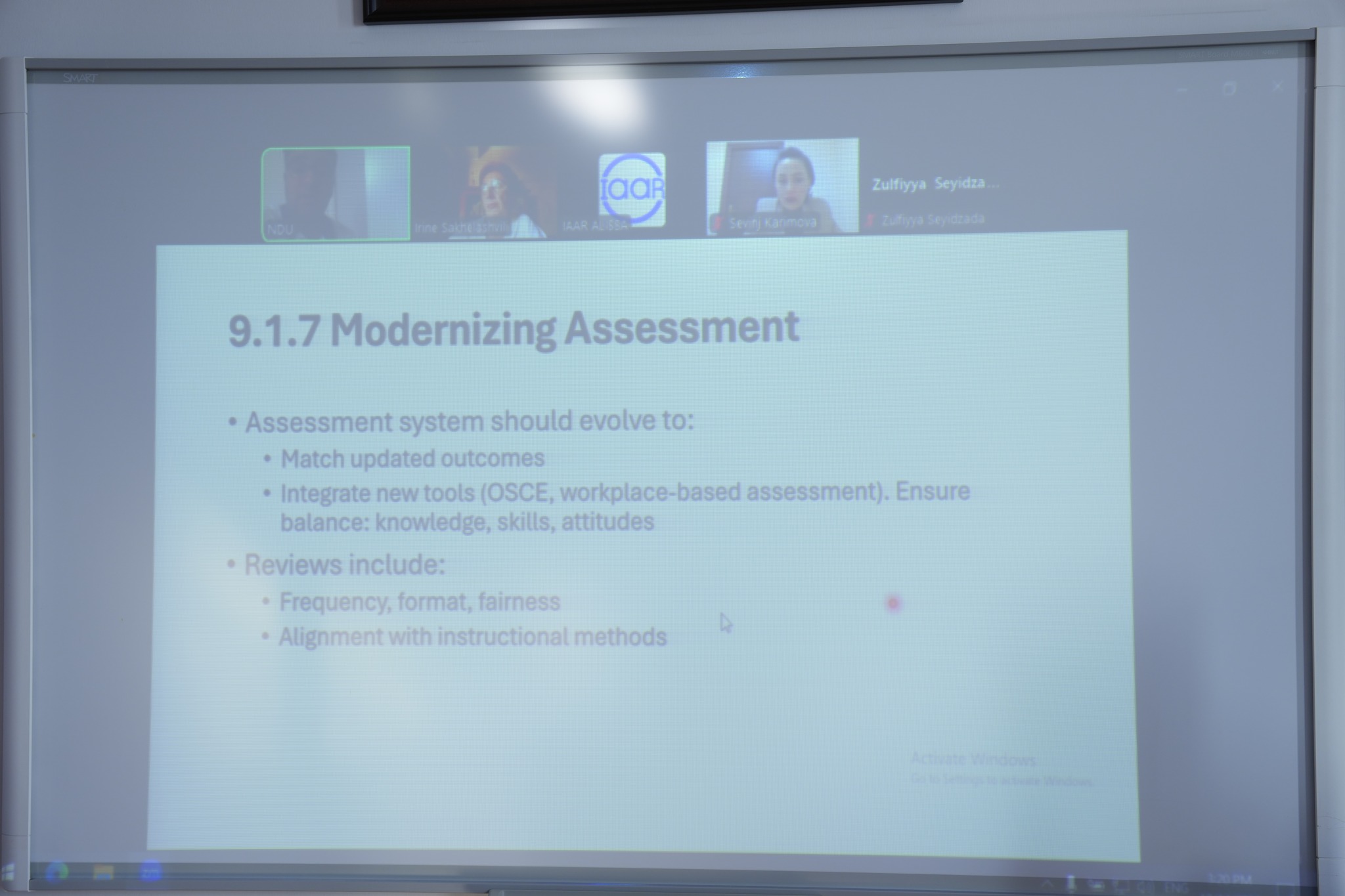 NDU-dan “Azərbaycan müəllimi”nə bildirilib ki, razılaşmaya əsasən, 14 oktyabr 2025-ci il tarixində bakalavr pilləsinin tədrisi ingilis dilində olan “Tibb” ixtisası üzrə IAAR şirkətinin ekspertləri tərəfindən gün boyu davam edən səkkiz saatlıq onlayn seminar təşkil edilib. Seminar zamanı beynəlxalq akkreditasiya meyarları, təhsil proqramlarının uyğunluğu və keyfiyyət göstəriciləri müzakirə olunub.